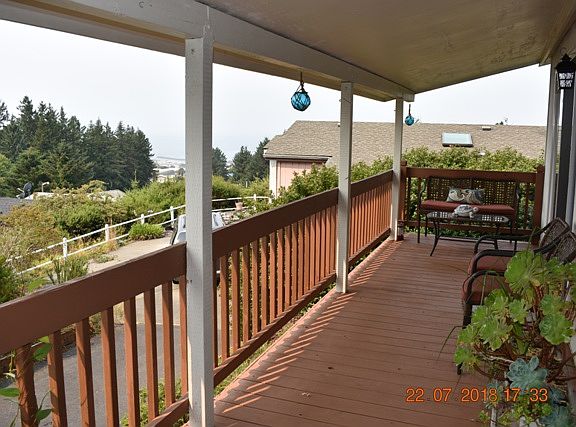 This 1995 GoldenWest home is located in a highly desirable over 55 park. Located at the top corner of Tonapah Village, it has fantastic ocean views (not just "peeks"). South facing, a covered deck runs the entire length of the house offering guests a great place to sit and enjoy the sun, sea views and fresh air. You can see the harbor, boats coming/going, and the coastline south. On a clear day, you can see the lighthouse off Crescent City. You can also see the ocean from the living room, two bedrooms and kitchen. An open floor plan with many windows and three sliders make it open and light. The backyard is lush with a rock water feature, small pond, and steps leading up to a viewing deck for additional ocean views. Add to that apple, pear, peach, apricot, and plum trees, blueberries, rhododendrons, a princess bush, and other nice landscaping features. The best part is that you have complete backyard privacy on all sides! Finally, there is a covered deck just outside the back door with room for table, chairs, and more. Major remodel in 2018. Brand new: roof, sky lights, vinyl windows, sliding glass doors, flooring, granite countertop, sinks/faucets, paint in and out, light fixtures, deck, trim, etc! Its in fantastic shape and move in ready! Very nice split floor-plan with a large living room, large dining and kitchen. Master bedroom is at one end and is large, even with a King bed and other furniture. It has it's own slider and ocean view! Master also has a built in vanity, large walk-in closet and additional shelving/storage in the on-suite bath. Master has a larger step-in shower with seats. Two other bedrooms are located at the other end of the house with a guest bath, which has a tub/shower. The large laundry room offers additional storage. If you are looking for a get-a-way or a full time home that's extremely nice, immaculate, and worry free, this is it! We invite you to compare to other places; this home is truly unique. Water, garbage and sewer are included in the space rent. There are two large parking spots (one covered) and a shop. Completely furnished with outdoor table/chairs included. Call to ask questions or arrange a viewing. Serious buyers only please.