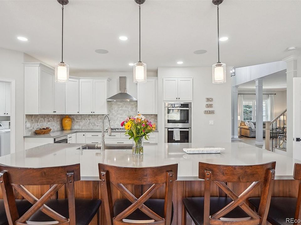 Beautifully Updated Home in the sought-after Eastridge neighborhood of Highlands Ranch. No detail has been missed with this incredible remodel, including updated kitchen with custom cabinets, quartz countertops and stainless steel Miele appliances. Enjoy the convenience of a spacious main floor primary bedroom with a stunning remodeled five piece ensuite primary bathroom, including quartz countertops, soaker tub, three part rain shower. Vaulted ceilings greet you as you enter the home with solid white oak flooring installed throughout the main level. This preferred floor plan offers a great floor plan with an additional two bedrooms upstairs with remodeled bathroom including a large loft area that can be used a workout space or office. This loft can also be easily be converted into a third upper bedroom. The basement has been newly remodeled giving you a large flex living space including a fourth bedroom and oversized bathroom. You'll love the large backyard with mature landscaping, waterfall feature/pond and two outdoor living spaces including flagstone patio off of kitchen and secondary gazebo with gas fire pit. Additional improvements of note include furnace replaced in 2022, AC replaced in 2023, water heater replaced in 2023, triple pane windows, solar panels (owned), hail resistant roof and updated plumbing throughout. You're conveniently located close to shopping, restaurants, C-470 & I-25 & walking distance to the award-winning Redstone Elementary School & Wildcat Ridge Park. The HRCA operates four state-of-the art recreation centers with Eastridge Rec Center only 2.5 miles away featuring outdoor volleyball courts, indoor/outdoor pools, fitness equipment & climbing wall. One of the gems of Highlands Ranch is the Backcountry Wilderness Area with open space, 26 miles of trails & various activities only steps away from your front door!
