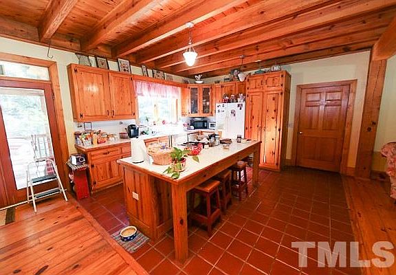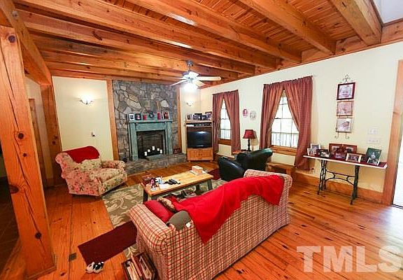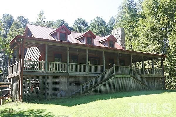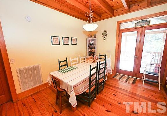 Rustic home in White Cross community west of Carrboro. Hand crafted by local contractor as personal residence. Built to last w/lumber milled from site. Pine floors, 6-panel doors, raised panel cabinets, post & beam construction. Great room/kitchen & master suite on main level. Upstairs, spacious loft/den & BR/bath. Basement w/garage doors & bath currently used as workshop/office, could be garage, rec room, or apt. Wraparound deck & screen porch. No HOA. Country living close to town!