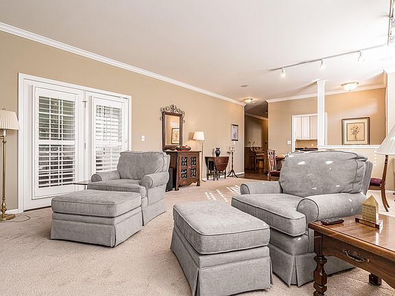 Welcome Home! 2 Bed/2 Bath with a Den and a Spacious 1st Floor, 1 Level Condo. Large Great Room with Ample Windows for Natural Light and room for the whole family. Home has Plantation Shutters on the windows. They are custom and will stay with the home. There are doors opening onto the large Covered Porch with a wall of windows with custom blinds so Natural light is always coming in. A great area for Relaxing and Entertaining. There is also a Dining area. The Primary Bedroom is large with a Trey Ceiling and a window over looking the Covered Porch. The Primary Bathroom is large with Jetted Tub, Walk-In Shower, Dual Sinks and His/Hers Closet space. The Kitchen is an Eat-In with a Large Pantry and a window for more Natural Light. The small TV will stay with the home.