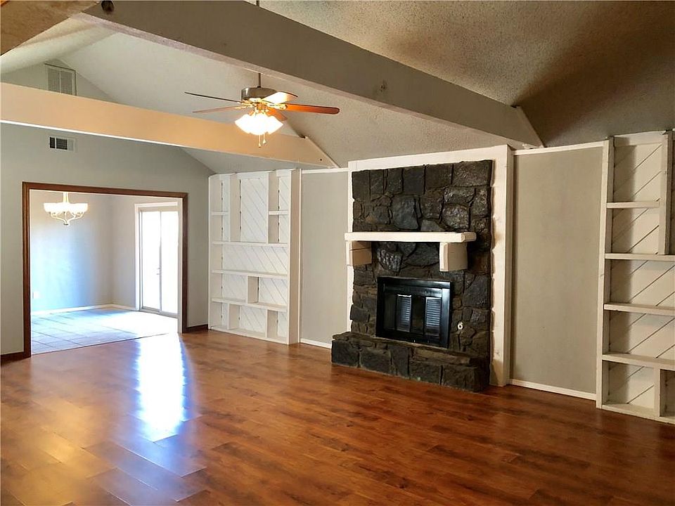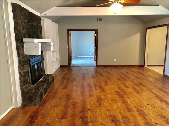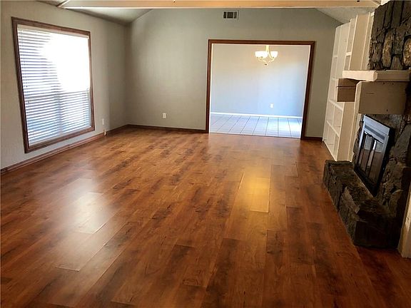 This 3 bedroom home with an office, or 4th bedroom option, has recently undergone a renovation with paint, carpet, appliances, flooring, and more. The living room has vaulted ceilings, a stone fireplace flanked by shelves, and laminate wood floors; its a spacious living room with a lodge-like feel. The kitchen has new granite counter tops, glass tile backsplash, and stainless steel appliances. Directly off the living room is a nice office with built-ins, or a 4th bedroom option. The bedrooms are all large. The master suite has vaulted ceilings and upper windows adding dramatic appeal. The utility space off the kitchen is large, allowing room for a mud bench or additional cabinetry. The windows are newer vinyl windows. The home has a two-car garage and a covered driveway for additional vehicle shelter from the Oklahoma Spring storms. You must see this home, as it offers so much in space and value.