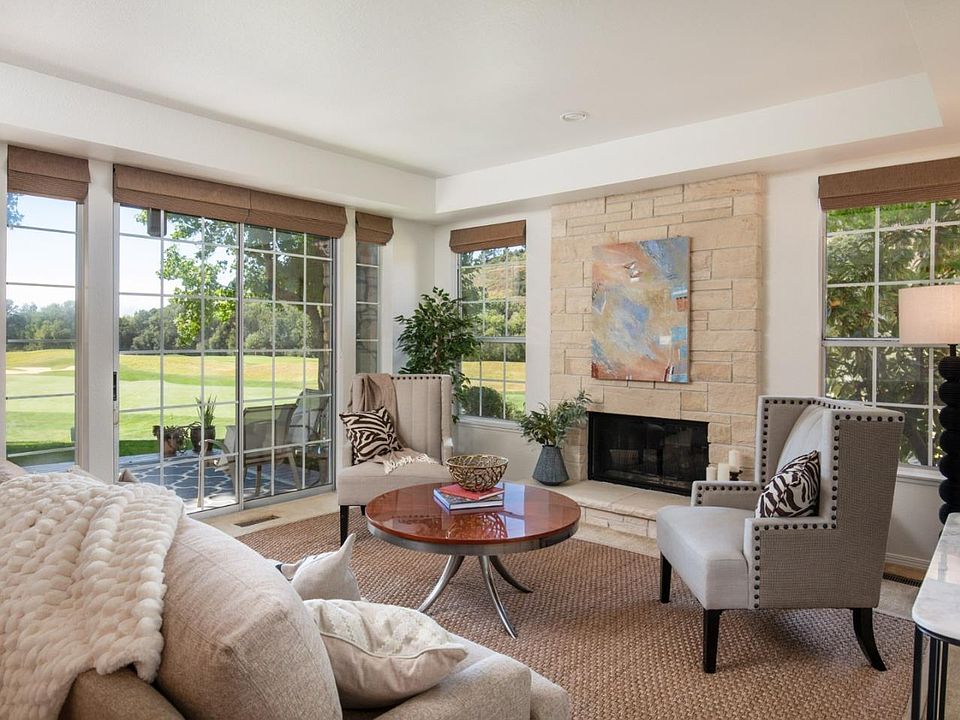 Impeccably located on Carmel Valley Ranch's 8th Fairway, steps away from the Golf Clubhouse and River Ranch, this sunlit 2-bedroom condominium offers an opportunity to embrace the Ranch's serene natural beauty. The updated kitchen features custom cabinetry, stainless steel appliances & a sun-filled garden window. A welcoming Carmel stone gas fireplace flanked by large view windows graces the light filled living room opening out to the expanded rear golf course & sunset view deck, perfect for a morning cup of coffee and al fresco dining. The spacious 2nd floor Primary suite features a Ca Gold stone fireplace, 18 cathedral ceiling, walk-in closet & large bathroom. An office area and 2nd suite with private bath, pond, golf & valley vistas complete the upper level. Do not miss this fantastic opportunity to join the Carmel Valley Ranch community and enjoy all the amenities the Ranch has to offer; Golf, Tennis, Fitness, Pools, and Dining within walking distance from your new home!