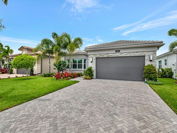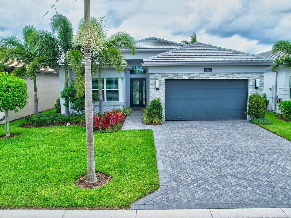 Truly exceptional, Contemporary brick front BIMINI on a water lot. From the widened driveway to the elegant glass etched front entrance, this is a home that must be seen. A four-bedroom, 3 full bath home with 24x24 porcelain, rectified tile in all living areas. The water views from the great room are amplified by the rare upgrade of the sliding and collapsing glass doors that wrap around 2 walls with zero corner, creating the feeling of the outside and water being part of your great room. Upgraded Carrier A/C warrantied until July 2031 with LG appliances with 3 1/2 years remaining on extended warranties. This home has been meticulously maintained and shows like the finest model home. If you are seeking an awesome home with a Clubhouse that rivals the finest Ritz Carlton resort, visit today