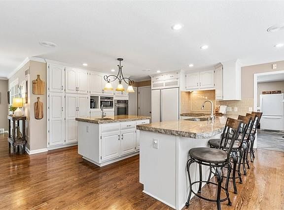 **Offer deadline 5pm 10/28** WELCOME TO YOUR DREAM HOME! RARE .6 ACRE LOT in the heart of Leawood Estates! Open concept living inside and sprawling entertaining space outside. Hardwood floors thruout interior. Gas fireplace w/ remote start. Main level living spaces are open yet still cozy. BONUS office on main floor. Kitchen has island, peninsula w/ seating, walk-in pantry, granite countertops, 2 sinks and dining area that overlooks STUNNING backyard. 3 main level bedrooms including primary bedroom w/ ensuite bathroom & access to back deck. 4th bedroom is on 2nd floor with walk-in closet and adjacent full bathroom - could also be used as primary bedroom. Newly remodeled lower level has LVT flooring, wainscoting, new bar area w/ island, new granite countertops, new tile backsplash & built-in fridge. Egress window and walk-out in lower level rec room provide great natural light. Non conforming 5th bedroom in lower level has enormous walk-in closet. Backyard boasts in ground pool, large patio, deck, built-in fire pit area and screened in porch PLUS additional green space to roam! THIS LOT IS A SHOW STOPPER!! Feel free to bring even your pickiest buyers :) 2022-10-29