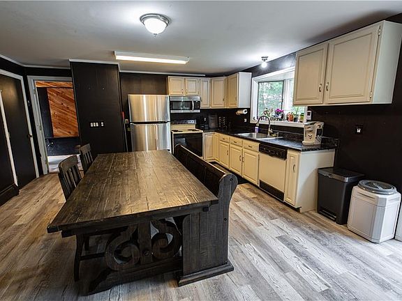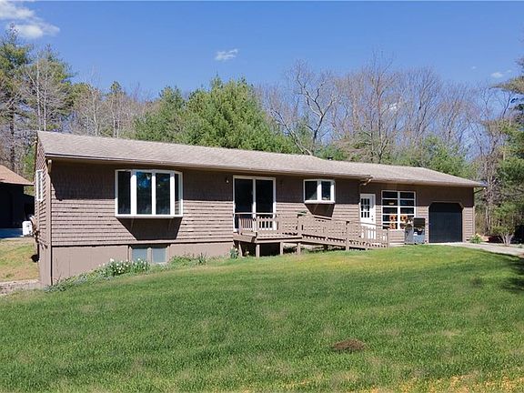 Welcome to your private oasis! This 3-bedroom, 2-bathroom home sits on over 3 wooded acres, offering tranquility and seclusion. The attached one car garage has both front and back garage doors for full drive thru access. The detached garage presents an ideal space for car enthusiasts, woodworkers , or entrepreneurial spirits alike. Fully insulated, drywalled, and equipped with heating, it also features a separate office area. Plus, it's primed for further customization, with prepped space and components for adding a bathroom if desired. Inside the home, there is a large breezeway which can be used as an additional family room, large mudroom, or office with lots of natural lighting. The eat in kitchen has a nice open flow to the living room. Two bedrooms upstairs and one downstairs in the walk-out basement. Basement has tall ceilings and open layout, perfect for creating even more living space! This property is the perfect combination of move-in-ready yet still has room for sweat equity.