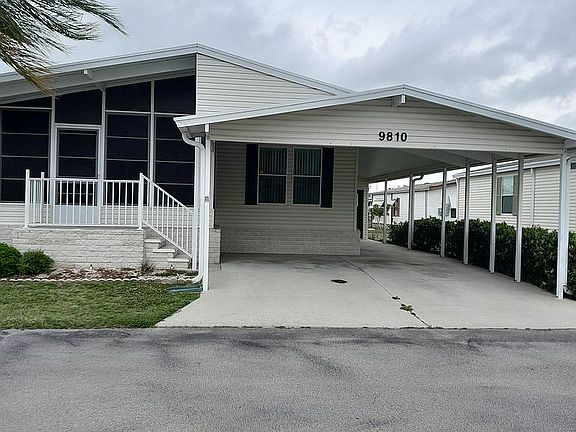 Welcome to 9810 Cape Haze. This home begins with a long covered carport, Both front and back doors covered. Front entry is into screened south facing porch. Entering into the large living space with vaulted ceilings and west facing windows. Living space has ceiling fan, vaulted ceiling. Flooring is laminate and linoleum throughout house. Dining area facing front of home with two windows, facing south and east. Kitchen has ample cabinets and includes range with microwave, dishwasher and refrigerator. Guest bedroom with west facing window. Hall bathroom includes shower over tub and vanity with skylight. Grand size master bedroom with large walk through closet and shelving on both sides. Master bath with double sinks and walk in tiled shower. Washer and dryer included. Outside of back door is a large storage/workshop. Brand new AC unit installed 2024. All under house maintenance completed in 2023. Roof was replaced in 2018. This home has no neighbor directly across facing, in great shape and ready for new owners. This is a private sale, feel free to ask questions. Must qualify with park. email kruiz4@yahoo.com. Text/Call 209-256-0263