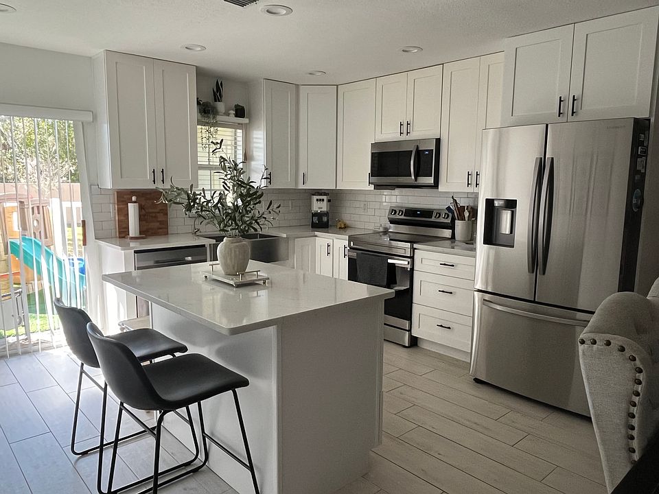 Large islandStunning renovated kitchenQuartz countertopsWood-look tile floorsPrivate fenced turf patioStainless steel appliancesWhite shaker cabinets