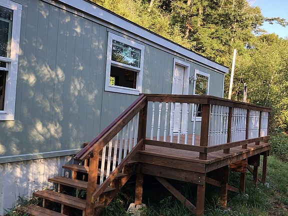 1994 single wide on 8.63 acres. 2 bed 1 bath. Washer/dryer hook-ups. Open floor plan. New deck, carport, windows, siding and paint. Interior under remodel. Lots of trees, bordered by year round creek with salmon run. Private location, surrounded by acres of forest.