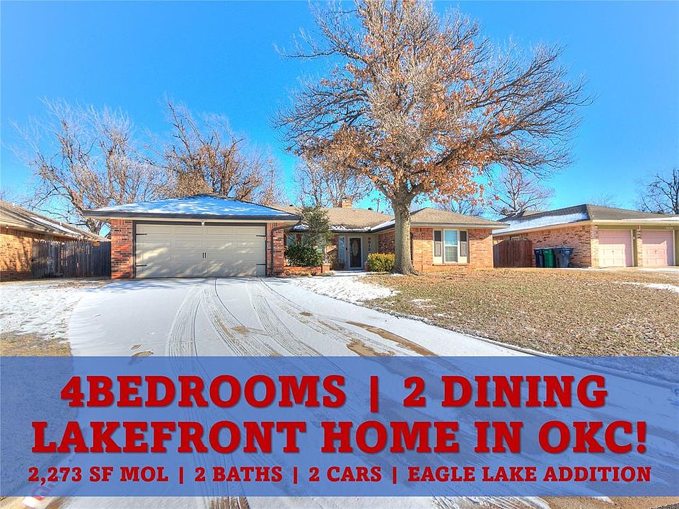 PRICE IMPROVEMENT!!! A CHARMING HOME WITH A LARGE BACKYARD IN OKC! Nestled in the highly accessible EAGLE LAKE ADDITION, this lovely home features 4 BEDROOMS, 2 BATHS, 2273 SF MOL, 2 DINING AREAS, HUGE LIVING ROOM & A STORAGE SHED in the backyard! This house opens up to a nice foyer that directs you to the spacious formal dining area with a nice street view on the left and on to the vast Living Room that feels so airy with its cathedral ceiling adorned with wooden beams and features a centered fireplace in a brick wall with built-in shelvings - such an ideal spot when entertaining your guests! Kitchen has coffered ceiling, granite countertop, built-in electric stove & oven and a huge breakfast nook with a backyard view which makes it a perfect spot for your afternoon coffee & tea. Primary bedroom features a primary bath with vanity, shower area and a huge walk-in closet. 2 other bedrooms share a jack-and-jill bathroom (1 connecting room currently used as the owners' dressing room) and the 4th one being used as an entertainment room. The huge backyard has an open patio and a large deck perfect for family cook-outs or BBQ nights with your friends! Home is minutes away from Kilpatrick Turnpike & Hefner Parkway, Mercy Hospital, dining, shopping & entertainment areas! Welcome Home!