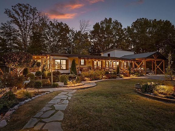 Welcome to 9812 Snow Hill Road, one of Ooltewah's most desirable streets. As you make your way down the long private driveway, you'll pass the well-kept mailbox, lush greenery, and manicured landscaping that immediately set the tone for what's to come. The property truly shines at dusk, when the landscape lighting softly illuminates the pathways, trees, and yard, creating an inviting glow that feels like home before you even step inside.
