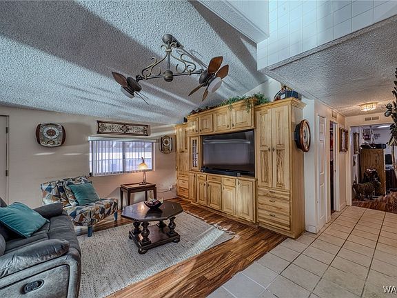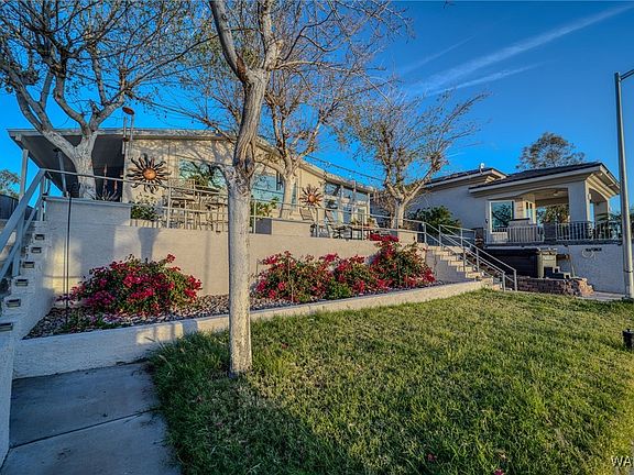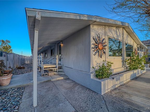 BEAUTIFUL RIVERFRONT PROPERTY WITH OWN PRIVATE BOAT AND WATERCRAFT DOCK. 60Ft of sandy beach on the Colorado River. Two manufactured homes. The front main home is a 2 bedroom two bath 1858 sq ft home, with an open living room and kitchen and large bay windows overlooking the water and beach.The Living room has a built in entertainment unit.The living room, dining room, and bedrooms all have wooden floors. The primary room has a long walk in closet There is an additional attached enclosed sun room and craft area with own mini split A/C ,as well as an equal size covered screened patio. Along with the sandy beach, the property has a grassy lawn area ,above ground spa, and an elevated covered patio with built in BBQ that leads to river wall and private dock. The back house is 650 sq ft and has 2 bedrooms and 1.5 baths with a full kitchen and living area, perfect for guests. Both homes have in door washer and dryer hookups. Between the two homes is a 24 ft by 40 ft garage with drive thru capacity and 9 ft doors, plenty of room for all your river and desert toys. In addition, there is a 3+1 car covered parking area and two additional storage buildings. All on .66 acre!!