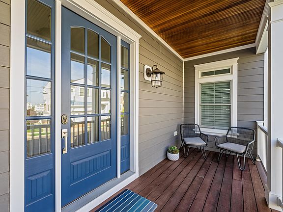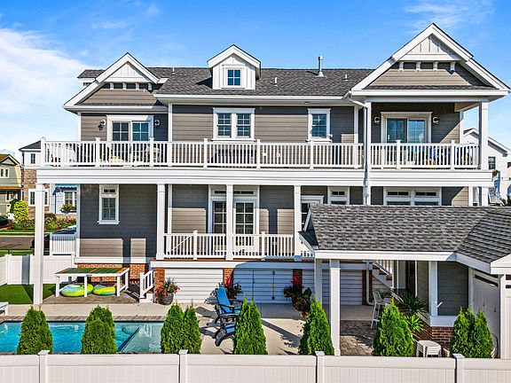 If you seek a quiet neighborhood within walking distance of everything, look no further than this custom 5-bedroom, 5-bathroom home handcrafted by JW Hand & Sons. Meticulously maintained, this 5-year-old home looks as good as it did on move-in day. Corinthian Drive is one of the most stunning blocks in Stone Harbor, being just 2 blocks from town, you will enjoy reduced traffic on this one-way street, a unique amenity this close to town. The exterior features flower boxes, exquisite trim, hardy lap siding, and a front porch with mahogany deck boards and ceiling. The lot is 25 feet wider than most, providing a generous backyard with a large pool and sun shelf, ample entertaining space, and a cabana, outfit with a sink, beverage center and electronic roll down shutter. Additional storage space can be found both in the detached garage, and under the home, where you can store all of your bikes, beach, and pool gear. Inside, the professionally furnished home boasts wide plank flooring, an extensive trim package and peaks of the bay throughout. The first floor includes a large junior suite with an en-suite bathroom, three additional bedrooms (one with a daybed), and a hall bathroom. A conveniently located powder room is accessible from inside the home and the pool area, with a laundry room finishing off this floor. Upstairs, the kitchen features a center island, beautiful stone tops and cabinetry, with shiplap vaulted ceilings running throughout, including the large dining area, adjacent to the kitchen. The family room, with vaulted ceilings and shiplap accent, is centered on a gas-fed fireplace, offering expansive bay views. A fully stocked wet bar with an icemaker and wine cooler are conveniently located off to the side. A large deck spans the entire width of the home, overlooking the pool area and providing a spacious seating area. The master bedroom, located opposite the family room for privacy, features vaulted ceilings, a large walk-in closet, and an en-suite bathroom. Through a set of sliding doors, a covered deck lends itself to a quiet place to enjoy your morning coffee. Close to town but away from the hustle and bustle, this almost new, professionally furnished, turnkey home is your perfect retreat. Offered fully furnished less a small list of personal exclusions.