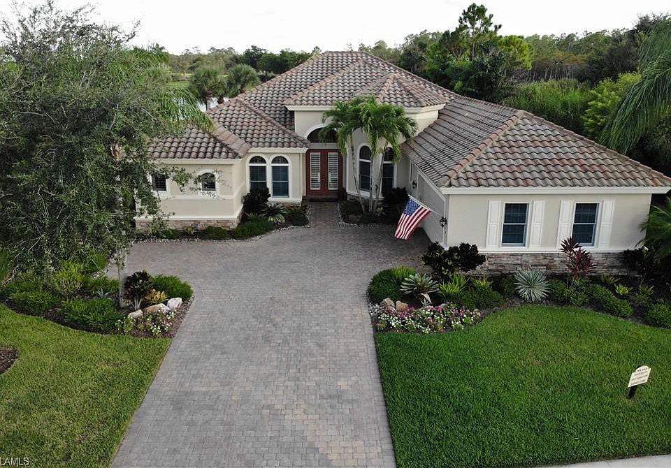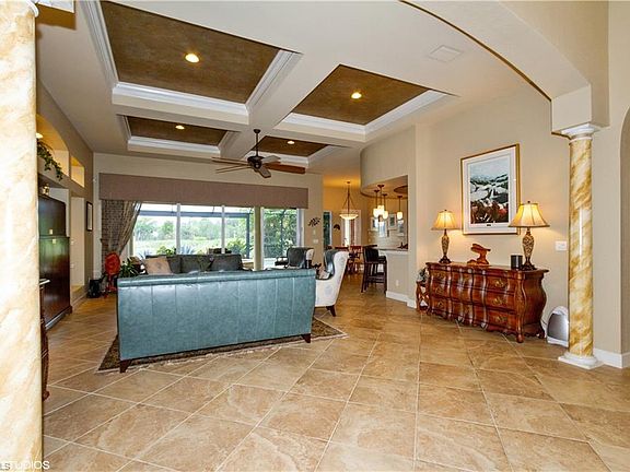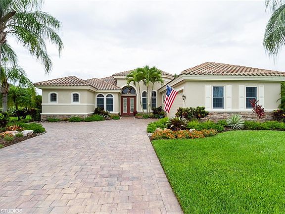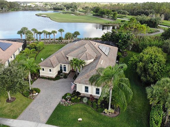 Location...Location....Location. If you are looking for the perfect home in a unique boating community, the Quarry has 500+ acres of lakes, a beach club with dining, resort style lap pools, fitness center, tennis, bocce ball, playground and an 18 hole private golf course. This Estate home is situated on a private oversized .52 acre lot with endless views of a large lake and the signature 15th Par 3 hole. This great room floor plan has over 3000 sq. ft of living area with 4 bedrooms plus den and 3 full baths. The expansive Lanai has been updated with a picture frame screened cage as well as a custom oversized pool, spa & pool bath. Entertain your friends in your outdoor kitchen and bar featuring a grill with hood, sink and refrigerator! Inside you will find upgraded tile flooring in foyer, kitchen, great room & hallways - hardwood in bedrooms! Granite countertops, backsplash, stainless steel appliances, and pendant lights in your kitchen. Crown molding, custom lighting, ceiling fans & plantation shutters. This fabulous home has roll down shutters, impact windows and energy saving Solar Panels for electric backup! Oversized 2.5 car garage bay fits 2 cars and golf cart