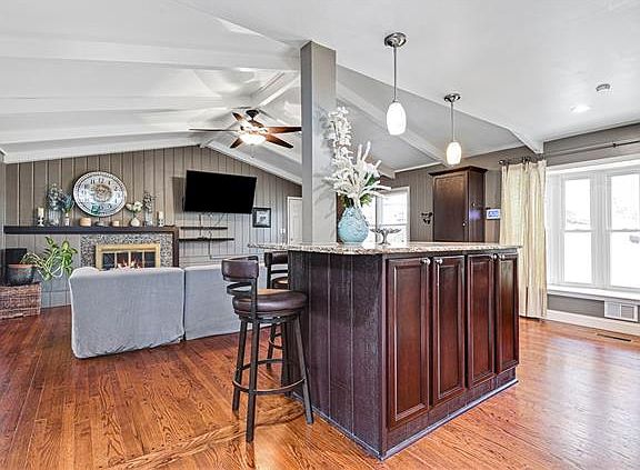 - Ceiling Fan(s), Kitchen Island, Pantry, Stained Cabinets