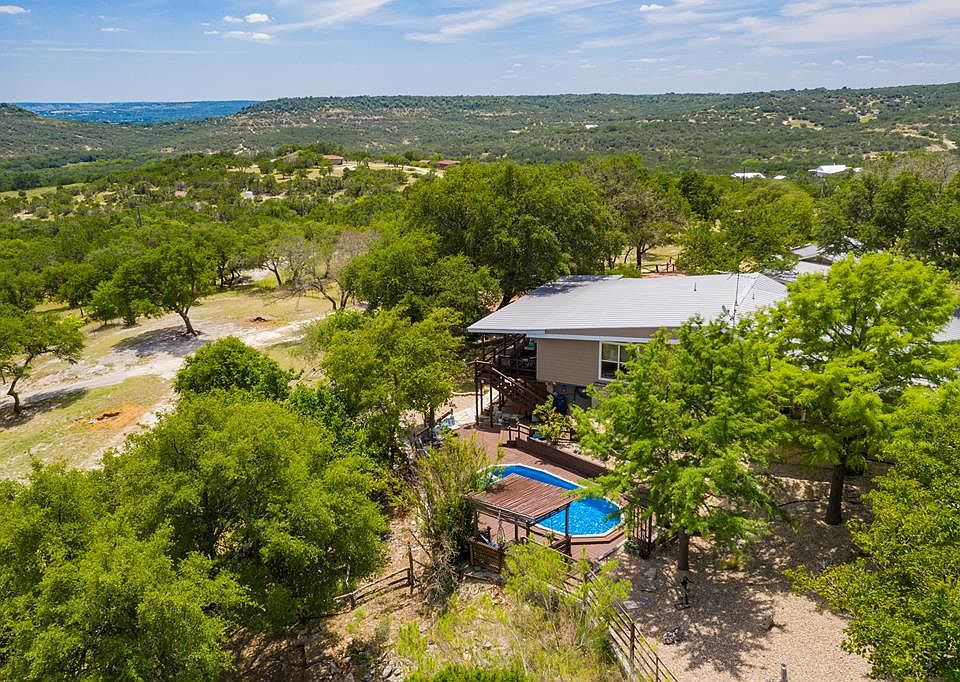 Approximately 25.63 ac with excellent views of the Blanco River Valley. A number of different tree-types have been planted for constant greenery, Fall color changes, and to create a more diverse aesthetic. Spring fed tanks. White-tailed deer, turkey, and varmints. Perimeter fencing is barbed wire and high-fenced. 2945sqft 3BR/2.5BA home built in 1979. Detached 2 car garage and black top entry. Home is cantilevered facing South making for incredible views of the Blanco River Valley. All carpet with inch hand cut wood paneling, all metal roofs, new heat pump, and new septic.