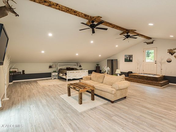 Don't miss this stunning, secluded home, on over 18 unrestricted acres, overlooking a beautiful natural creek w/ dock! This home is truly one-of-a-kind w/ soaring vaulted ceiling and abundant windows! The primary suite features large walk-in closet w/ window and gorgeous en suite w/ custom tile shower and jetted tub along w/ dual vanity. You'll love the open office area upstairs, overlooking the gorgeous sunset views! Loads of finished space down creates the perfect entertaining area, w/ media room, family room, game area w/ wet bar, and room for exercise equipment and a craft room, this home definitely has it all! Relax and take in the stunning views all around you on the multi deck options! The oversized 4 car detached garage features an amazing loft as well! This is a MUST SEE!