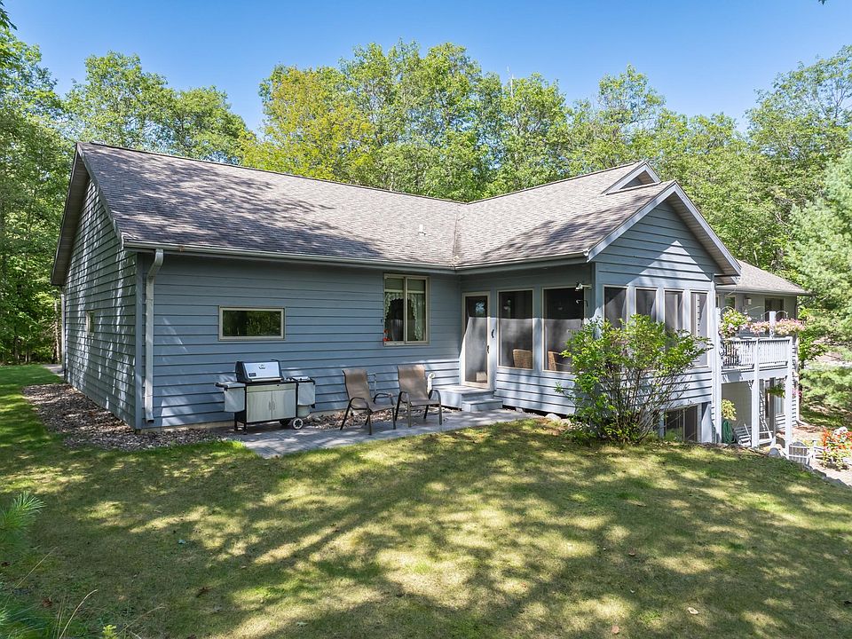 Lakeside home on Yawkey Lake. Offering an open concept kitchen, dining and living room area featuring a two sided gas fireplace on the main floor, this home offers a light and airy feel, further accentuated by the lakeside screened in porch. Also on the main floor are a spacious primary suite, den, office, and laundry room. The walkout lower level includes a family room with a wet bar, 3 bedrooms, a bath, and extra storage space. A 3 car attached garage and professionally landscaped patios, lakeside balcony/deck, firepit area, and dock complete the convenience of this charming home. Exclusive Agency Listing - Single Party Sale.