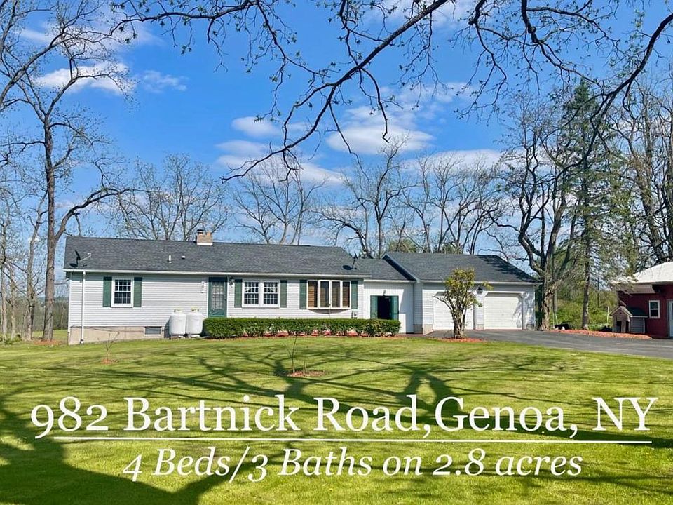Convenient location for this Custom-built two level home with 4 large bedrooms, and 3 full baths, attached 2 car plus a bonus 2nd garage on just under 3 acres. Public Water. The main level boasts a large eat in kitchen, formal living room and den or office space. The primary bedroom and full bath ensuite, main full bath and bedroom is tucked away on the main floor from busy life. All 4 large bedrooms have closets and great light. The lower walkout level has large family room, laundry, plenty of storage. There is a versatile breezeway that acts as a mud room, coat room, storage, pantry, and all things house. The oversized attached 2 car garage never get rain or snow. The grounds are level and sprawling and have had horses, chickens and great garden space. Deck off breezeway offers outdoor relaxation place. Convenient to commute to Ithaca 30min, Cortland 30 min, Auburn 30 min. High speed internet. King Ferry is in the town of Genoa.