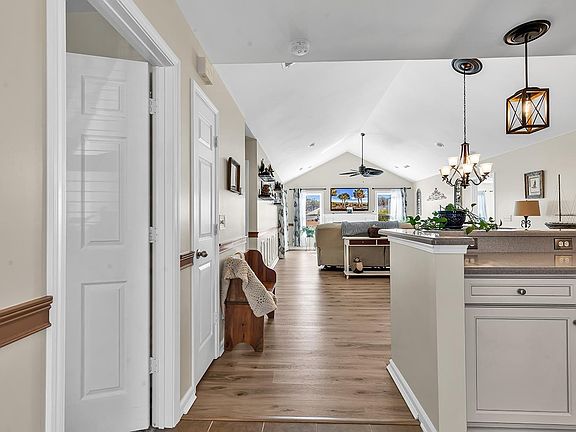 This single level home has great curb appeal with its well-manicured lawn and beautiful landscaping. A covered front patio and a large rear patio with a fenced yard overlooking one of the best water views in the community. When you walk through the front door, you see the large kitchen with an open floor plan and cathedral ceiling showing the dining area and living room. As you look over the open area with tile and wood floors, you see the Fireplace on the backwall. The kitchen has a breakfast bar, Breakfast Nook,lots of open counter space, plenty of cabinets with a pantry and lots of room to work. The kitchen gives access to the utility area and 2 car garage allowing easy unloading of groceries from the car to the kitchen. The split bedroom floor plan allows for privacy. The primary bedroom has plenty of room for your furniture and has a wonderful view of the backyard and water. The primary bath has double sinks, shower and Whirlpool tub. The other two bedrooms on the other side of the home have plenty of room and access to the full bath. Off the Livingroom in the rear of the house is a great 3-season room overlooking the back yard and lake. the roof is 4 years old, the HVAC System with Electric Air Filter is 7 years old. This well-maintained home is bright and is ready for you to move in. All measurements are approximate and not guaranteed; the buyer is responsible for verification. The home also has a lawn sprinkler system, Vinyl Mesh Hurricane Shutters, concrete curbing around gardens, concrete painted/stamped walks and patios, fenced rear yard and water view.