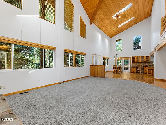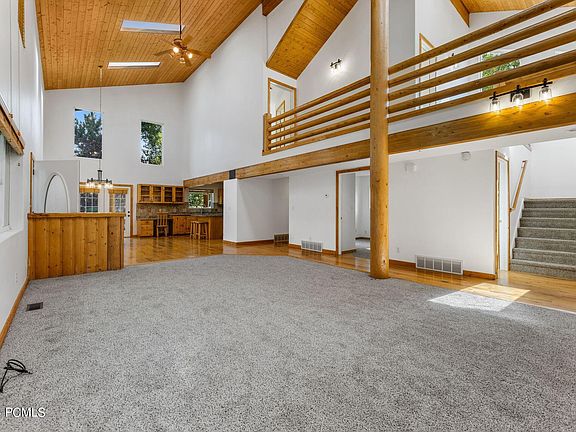 Discover this stunning 3 bedroom, 2 bath log sided home nestled on a beautifully landscaped one acre lot. Located in a serene neighborhood, this property offers incredible mountain views in all directions. The spacious interior features breathtaking vaulted ceilings, a large stone wood burning fireplace and a generous dining and kitchen area perfect for family mealtime and entertaining. Enjoy the outdoors with two large decks ideal for relaxing and taking in the natural beauty of the property and the area. The home also boasts a 3-car garage and a possible basement apartment with an exterior entrance offering great potential for additional living space or rental income. The location provides a milder climate than other high elevation homes. Move in ready, this peaceful retreat awaits you! Square footage figures are provided as a courtesy estimate only and were obtained from previous appraisal. Buyer is advised to obtain an independent measurement.