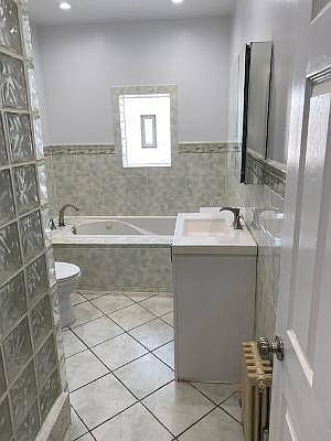 Morris park - Beautiful renovated 2 Family Brick with garage and private driveway. This house boast a very large 3 bedroom duplex apartment with one and a half baths, large living room, dining room with front and rear porches. Hardwood flooring, large jacuzzi tub. The second apartment is a beautiful one bedroom apartment. Nice backyard, new roof, driveway and sidewalk. Gas boiler. House is ready to move in. Delivered vacant.