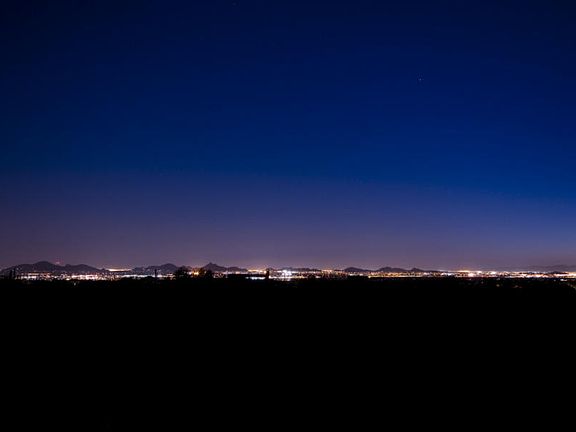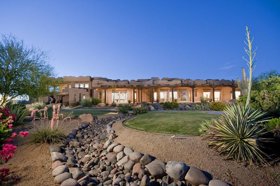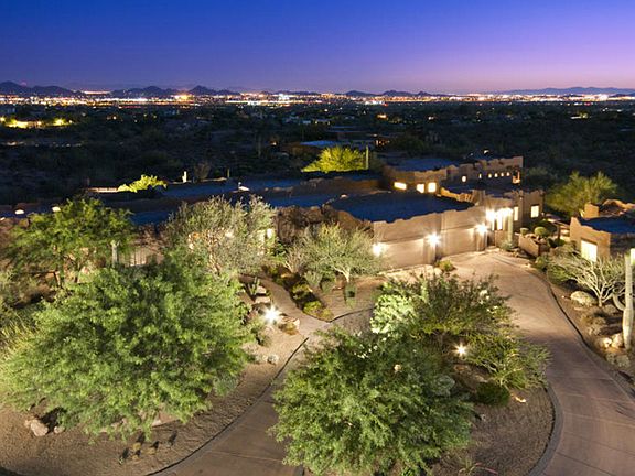 Santa Fe style elegance, capturing unobstructed City and Mountain views. One of three homes along this private road, built on approximately a 5 acre parcel each. Exquisite finishes, custom upgrades, a functional floor-plan, just a perfect value. The entire home lives on one story with the exception of an upstairs den/library where you'll also discover a full bath, an outdoor fireplace, a private patio overlooking a more spectacular city light and mountain backdrops. The spacious gourmet kitchen opens to a great room and a breakfast nook area; formal living and dining including Venetian Plaster adding that extra charm. The home includes multiple covered patios, media/game room, home office and a 1,800 sqft detached Guest Home. Can be used as a Horse Property and very easy to preview.