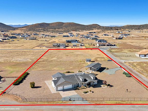 Welcome to this extraordinary 4-acre homestead, offering a total of 3,333 sq. ft. of beautifully designed living space. Perfectly blending luxury, functionality, and country charm, this property features a main residence (2,649 sq. ft.) and a custom detached Casita (684 sq. ft.), all situated on a double lot of 4 acres with a 3-car garage and sweeping views of Prescott Valley's stunning sunsets, city lights and mountain views. Thoughtfully designed for modern living, the main home features 4 spacious bedrooms and 3.5 bathrooms, including a beautifully appointed primary suite. The gourmet kitchen is the heart of the home, showcasing custom cabinetry, quartz countertops, a 12-foot island, gas cook top, and an oversized walk-in pantry—ideal for the home chef. Entertaining is effortless with open-concept living spaces that flow to an extended paver patio and pergola, where you can relax and enjoy breathtaking sunsets and panoramic views. A true 1-bedroom, 1-bathroom retreat, the Casita offers a full kitchen with quartz countertops, custom cabinetry, W/D hookups, and a private gated entrance with dedicated parking. Perfect for guests, in-laws, this self-contained space provides both comfort and independence. Move-in ready with modern finishes and design. 4-acre double lot with 2 fenced acres, perfect for horses, chickens, or small livestock. Automatic solar gate for convenience and security. Two wells: one with 10 GPM flow, and a second for irrigates the lush landscaping and many fruit trees. A large TUFF shed is perfect for additional storage. Breathtaking sunsets and night views of Prescott Valley from multiple outdoor living areas. This exceptional property offers endless possibilitieswhether you're looking for a peaceful retreat, multi-generational living, or a small ranch-style homestead. With space, privacy, and luxury combined, this is a rare opportunity to own a truly one-of-a-kind Arizona estate. Don't miss your chance to make this exceptional property your forever home. See the Documents in the listing for floor plans, features of the home, CC&Rs and additional HOA information. Main house completed in 2020 and Guest House 2649 SF/Casita was completed in 2021 and is 684 SF, garage is 987 SF.