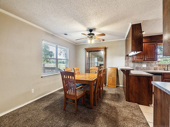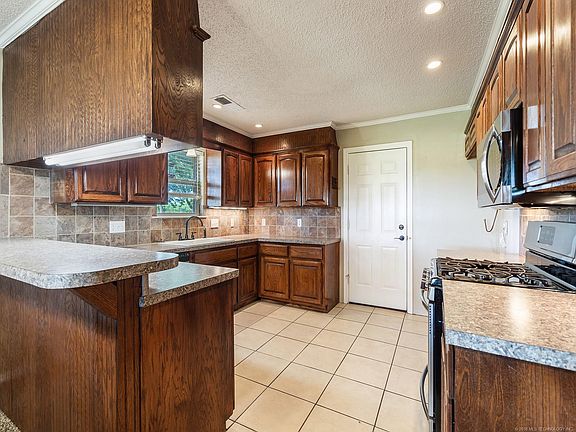 Updated home with large living areas, spacious bedrooms, Huge deck in the back yard: Large detached shop and the attached garage w lots of storage & parking space. Backs to a green belt. Located with in 15 minutes to downtown Tulsa or to Skiatook lake
