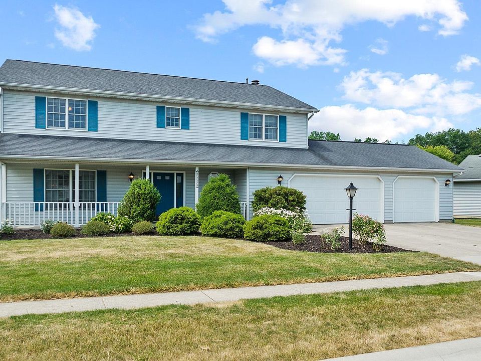 This 2,500+ finished sq/ft 5BR 2.5 BA home was built by Dick Scherer, boasting 2 x 6 wall construction and upgraded insulation. This home has spacious rooms, fresh carpet, neutral colors and a 3-car garage! The covered front porch leads into a spacious foyer then to the formal living room that flows to the formal dining room with hand scraped wood flooring, then into the amazing kitchen with stone counters, breakfast nook/center island, built-in desk and gas oven/range. This space is open to the gorgeous family room with wood/gas start fireplace and custom corner built in for your TV and storage. Sliders lead out back to a concrete patio and large back yard. A half bath and 11 x 10 laundry area complete the main level. Upstairs, all 5 bedrooms have fresh, neutral carpet. The primary bedroom has a walk-in closet and en-suite with dual sinks & large linen closet. Bedrooms 2-5 share the homes 2nd full bath, also with dual sinks. The water heater was replaced in 2016, HVAC in 2009 and the roof is 10 years old. New Haven has a quaint & inviting downtown, furnished with mom and pop stores, a handful of great restaurants and a gorgeous little park that becomes a stage for festivals, markets and music in the summer. It is just minutes from NE Fort Wayne amenities and has quick and easy access to I-469 and downtown Fort Wayne.