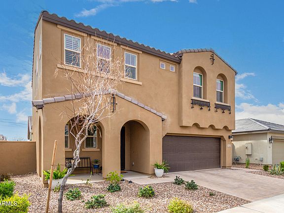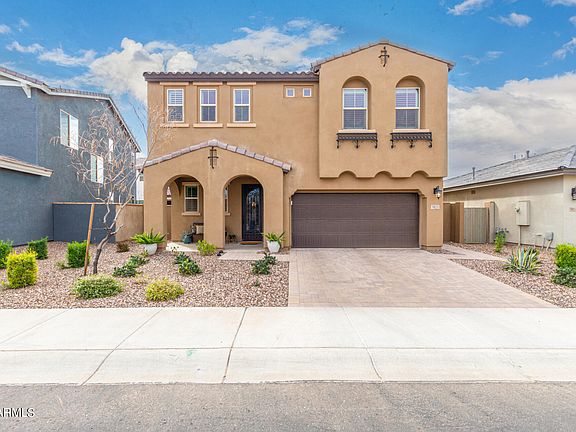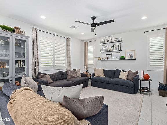 Welcome to this thoughtfully upgraded home in Eastmark!! Captivating interior features designer tile flooring, dazzling light fixtures, plantation shutters & sliding glass doors opening to large back patio, merging indoor with outdoor living. Gorgeous extended floorplan kitchen boasts white shaker cabinets, stylish tile backsplash, Silestone quartz counters, walk-in pantry, SS appliances, & island with breakfast bar. Main suite showcases soft carpet in all the right places, private bath with dual sinks & custom walk-in closet. Laundry room boasts electric or gas option. CenturyLink Rough In fiber optic wiring. You'll love hosting fun gatherings in the fabulous backyard, including a full-length covered patio & easy-care landscape with wireless drip irrigation! Don't let this home pass you b