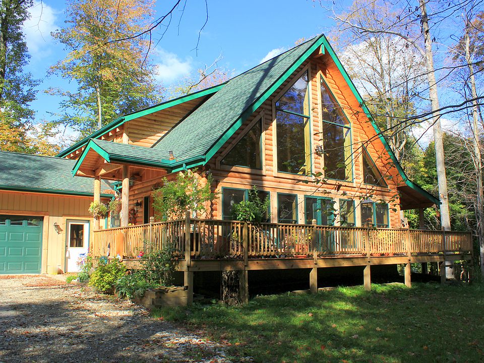 Don't Dream a Dream - Buy One! Maximum privacy in this wonderful 3 bedroom, 2.5 bath log & timber home boasting a vaulted great room with wood burning fireplace and a wall of windows overlooking an expansive wrap-around deck! Beautiful and open first floor featuring inviting chef's kitchen and a spacious dining area with stunning chandelier! First floor Master Suite with doors to the wrap around deck and access to lower level paver patio. Second floor bedrooms feature large walk in closets and loft overlooking first floor living area. First floor laundry. Full, unfinished basement. 3 car garage. Enjoy gorgeous views in this very private, tranquil location. Heavily wooded and surrounded by nature! The Fireplace in the great room can also be converted to a 2-way outdoor fireplace on the deck! Your private resort awaits you!