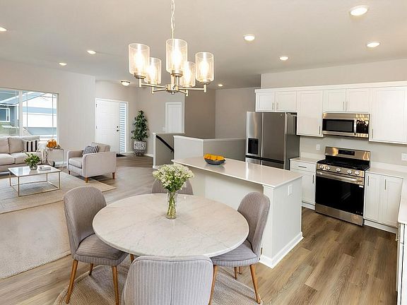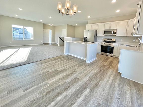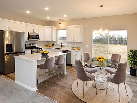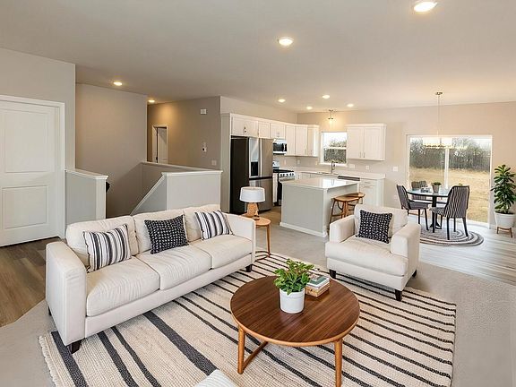 COMPLETED NEW CONSTRUCTION ready for quick move-in! One Level Single Family Home on a Walkout Homesite! The Pine floor plan features an Open Concept Main Living Area including 3 Bedrooms, 2 Bathrooms, Kitchen, Dining Room, Great Room, Laundry Room, Mudroom, and 9' Ceilings. Kitchen offers spacious center island & window with backyard views. Primary Suite includes a private bath & walk-in closet. Unfinished Walkout Lower Level is ready for future finish including future family room, 4th & 5th bedrooms, and bath. Front elevation features stone accents and a spacious concrete front porch. Sod, irrigation system, & front yard landscaping included. Some photos may not depict actual plan, materials, & finishes may vary. All measurements are approximate.