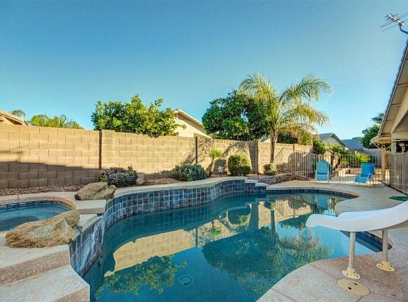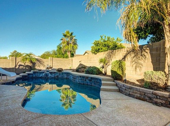 Fantastic Home inside and out. Meticulous desert landscape and move-in ready Home. Dramatic soaring ceilings, soothing color palette, plush neutral carpet, upgraded lighting, window blinds, and tile floor in all the right places. Formal dining/living room. Spacious eat-in kitchen features center island, breakfast bar, white appliances, and wood cabinetry. French Door to patio from family room. Great Home for entertaining! Huge backyard boasts refreshing fenced pebble tec pool w/waterfall, spa, fire pit, covered patio, and endless blue skies. Community Playground. Call today to tour this wonderful Home and all it has to offer!