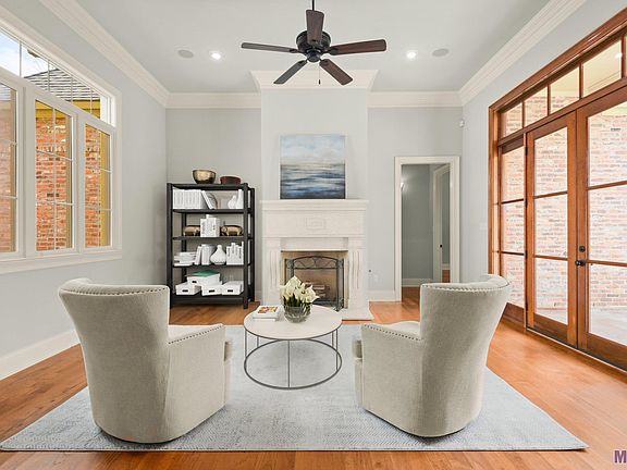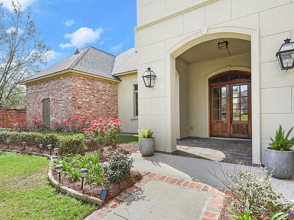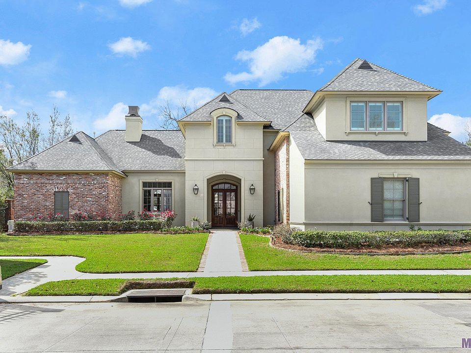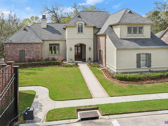 Just inside the gates of a one street neighborhood off Highland Road sits this French style home with a unique floorplan that offers a spacious design great for entertaining. As you enter the foyer, there are two pocket doors to the left that open to a study with an Isokern wood burning fireplace and French doors that open to a back patio. The primary suite is accessible through the study. An en suite bathroom contains dual vanities, walk-in shower, beverage station and a spacious closet w/ utility hookup for a stackable washer & dryer. The massive, exposed brick archways separate the entry from the formal dining room with easy access to the wet bar area. A spacious gourmet kitchen contains a large center island w/ dual sinks and dishwashers. There is also a 6-burner gas cooktop, double ovens, refrigerator and a walk-in pantry. The kitchen is open to the living space with travertine floors surrounded with large windows allowing lots of natural light within and another Isokern fireplace. Upstairs are two bedrooms each with a separate bathroom and a bonus area that could be used for multi purposes. There are two rear patios one of which consists of a built-in gas grill and sink. The house is also equipped with a whole house generator, outdoor security cameras, landscaping and a two-car garage with separate attached storage.