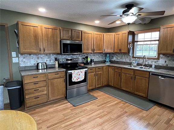 Looking for a move in ready ranch? Step into the front door & be greeted by the living, dining room, & kitchen. The kitchen has an updated stainless steel appliance package & beautiful tile backsplash. Off the kitchen there is a spacious laundry room which leads out to the 2 car attached garage w/built in shelving. From the dining room, there is a patio door leading out to the 30x15 deck with 220 Hookup for a hot tub & 18x12 patio area with gorgeous wide open backyard views & 14x28 shed with electric. The master bedroom is very spacious & includes 2 closets as well as a full bath. The main bath has been remodeled with new vanity top & tiled tub/shower surround with glass doors. This home has mature landscaping inc. custom poured concrete curbing & perennial plants. The additional rocked parking space next to the driveway is perfect for extra vehicles, camper, or trailer parking. Roof 2004. Water Heater 2022. This home is ready for new owners, just bring your stuff & move right in.