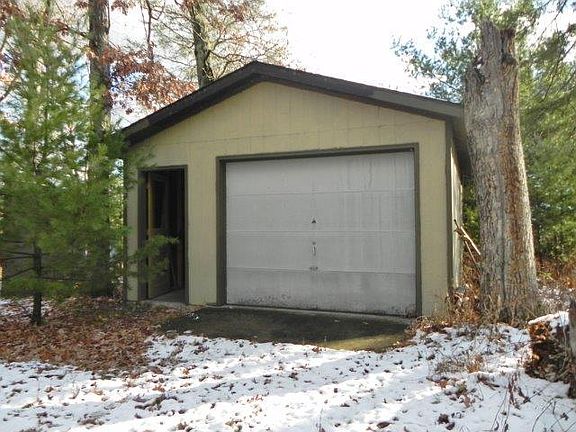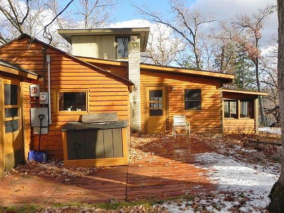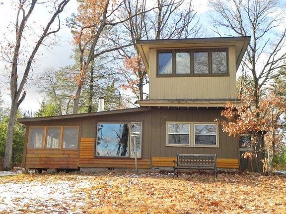 Unique cabin on Bluff Lake. Wood interior, separate dining room, living room with woodstove & spiral staircase to upstairs addition with great views. 3-season porch plus 1-car detached garage. Wooded, 1.06 acre lot with 109' frontage on Bluff Lake.