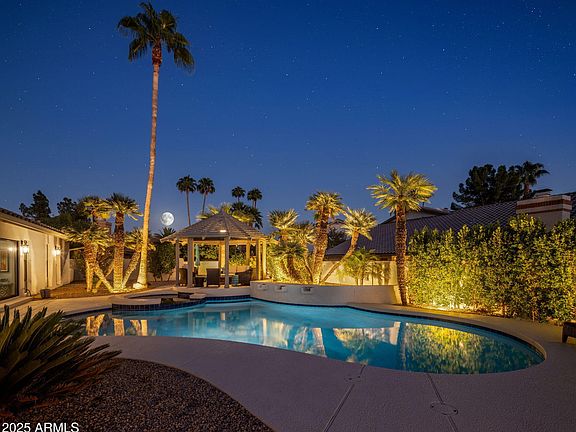 Experience refined desert living in this beautifully remodeled Scottsdale Ranch residence, blending timeless design with modern luxury. Fully renovated in 2020, this 4-bedroom, 2.5-bath home offers 2,909 sq ft of open, light-filled living space with high ceilings, elegant finishes, and seamless indoor-outdoor flow. Step through the dramatic double-height entry into an inviting great room with rich flooring, designer lighting, and multiple seating areas ideal for entertaining or relaxing. The chef's kitchen impresses with sleek white cabinetry, quartz countertops, stainless steel appliances, and a spacious peninsula overlooking the dining area, family room and pool. The primary suite is a serene retreat featuring a custom chandelier, his/her walk-in closets, and a spa-inspired bath with dual vanities, walk-in shower, and a jetted tub framed by a picture window. Throughout the home, custom window treatments add both comfort and sophistication including automated shades on the back sliding doors and the upper west-facing window, complemented by matching manual shades on all other windows. Outside, enjoy resort-style living in a private backyard oasis complete with a sparkling pool, raised spa, covered ramada, and lush landscaping. The side patiocomplete with pergola swing and seating arealeads to a private putting green. A smart misting system, keeps the outdoor spaces cool and comfortable year-round. Located in the highly sought-after Scottsdale Ranch community, this home combines sophistication, functionality, and comfortjust minutes from premier dining, shopping, and lakeside recreation.
