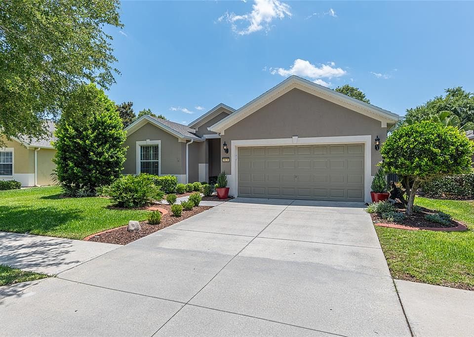 Sheridan 3/2/2 on a very private, oversized yard with mature landscaping and fabulous curb appeal. This home is nestled into the completed of Arlington within Stone Creek on a short tree lined street. Exterior has storm door, mature landscaping with custom plantings, cement edging and mulch. The rear has privacy landscaping with screen enclosure with pavers and 3 ceiling fans. Enter thru the tall entrance door and you will immediately see the wood flooring, crown molding, ceiling fans, custom lighting, custom drapes, shutters and updated kitchen. Cherry 42" cabinets with crown molding and pull outs on lower cabinets, SS appliances, granite countertops and tiled backsplash. Bedrooms are all custom painted, carpet, and window treatments. Baths are updated with primary having a new shower renovation, new countertops, faucets, mirrors and lighting. The real gem on this home is the peaceful setting in the rear yard. Come take a good long look, as Stone Creek is the premier active community in Central Florida and the amenities are second to none. Your new neighbors and friends await you!!!!!!