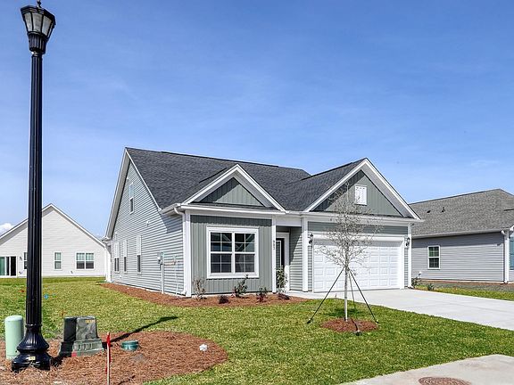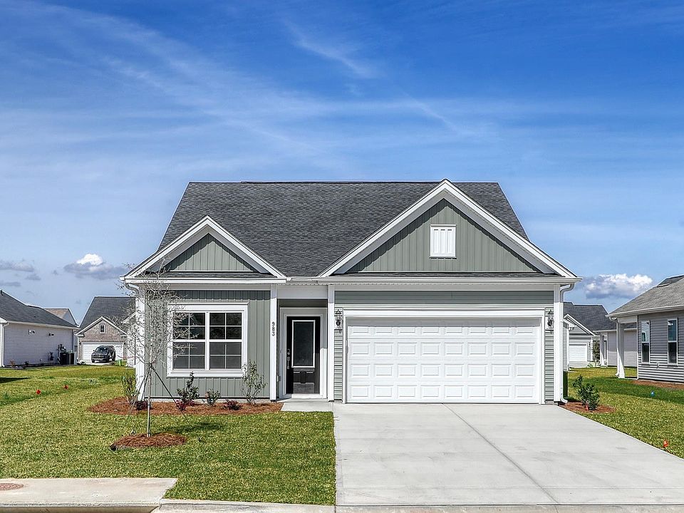 The Hatcher is a two-story floorplan with three bedrooms and three bathrooms. A guest bedroom is located at the front upon entry, along with a separate full bath and linen closet. Luxury vinyl plank flooring extends throughout the main living areas on the first floor. The living room is open to the kitchen and eat-in area. The kitchen features a corner pantry, upgraded gray cabinets, white tile backsplash, and quartz countertops. The backyard is accessible through the eat-in area and offers a covered porch. The primary bedroom is also on the first floor, situated off the gathering area, and includes a tray ceiling. The ensuite bath has a double vanity with quartz countertops, a five-foot tiled shower with a glass enclosure, and a large walk-in closet. Upstairs is a guest suite with a private bath. This home is complete with a laundry room at the garage entry with a laundry folding table. Gutters and full irrigation system included! Merrill Villas is in the heart of Carolina Forest offering convenient access to amazing shops, restaurants, championship golf courses, and Myrtle Beach International Airport, and is less than five miles to the beach!