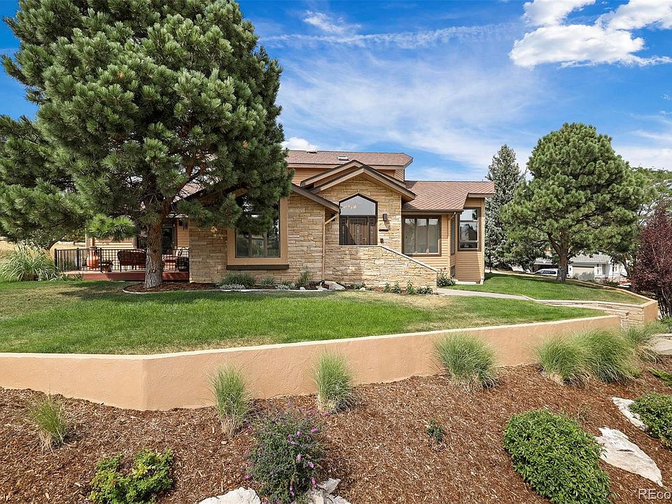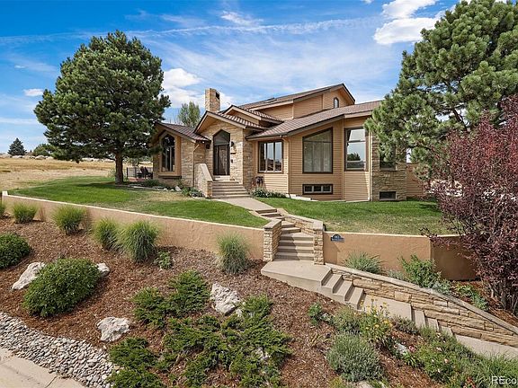 Great find on the highest point in Castle Pines: Fully-Custom home with neutral-tone stone and wood exterior on a large lot with mature trees and great views! You will note the interesting angles to both roof line and windows as well as its organic feel to its location set against cloud-studded blue Colorado skies. The unique and intricate wood entry door opens to a main level whose wood grains are both beautiful and welcoming. The two-level kitchen island lets the chef create while chatting with friends, then move to the open and bright dining room where the windows almost make you feel as if you are eating outdoors. Also on the main floor is a large study, laundry room, and the master bedroom - with its high ceiling, skylight, stone wall fireplace, access to private deck, and sliding barn door to the updated master bath. Its large, open feel includes a beautiful, glass-door shower, stand-alone modern tub, and plenty of cabinetry and double-sinks. Wander downstairs to enjoy the basement family area with its fireplace, bar, exercise room and large steam shower. This home has hot water heat and a whole-house fan. Set a showing for this serene setting today!
