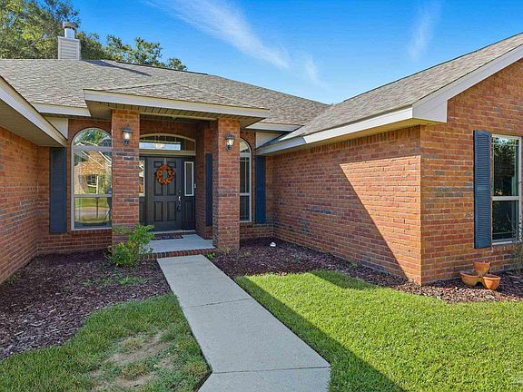 STUNNING BRICK HOME IN ONE OF THE MOST DESIRABLE CANTONMENT NEIGHBORHOODS! Step inside this beautifully designed brick home you’ve been searching for. The spacious living room features vaulted ceilings, an elegant flat-hearth gas fireplace, large windows, and French doors that open to the covered patio—perfect for outdoor dining or relaxation. The formal dining room offers an elegant yet inviting setting for family dinners and special occasions, while the versatile bonus room across the hall provides endless possibilities—perfect as a home office, media room, or additional living space to suit your needs. The kitchen is expansive, featuring granite countertops, stainless steel appliances, a flat-top electric range piped for natural gas, a free-standing island, and a breakfast bar. A large adjacent space can function as a breakfast area or family room, with convenient French door access to the covered patio. Nearby, you’ll find a spacious laundry room and a half bath. The primary bedroom offers a relaxing retreat with a luxurious en-suite bathroom that includes dual vanities, a soaking tub, a separate shower, a private water closet, and dual oversized closets. Additional highlights throughout the home include Kevlar window shields, several boxes of LVP flooring for future use or replacements, custom cabinetry with hidden hinges, crown molding, bullnose corners, 5¼-inch baseboards, rocker light switches, and brushed satin nickel lever-style door hardware. Recessed lighting enhances the kitchen, bathrooms, and main living areas, while crown molding and chair rail add refined detail in the dining room and primary bedroom. Exterior features include four sides of brick, a sodded yard, and energy-efficient double-pane Low E366 windows. Assumable Mortgage available to qualified buyers!
