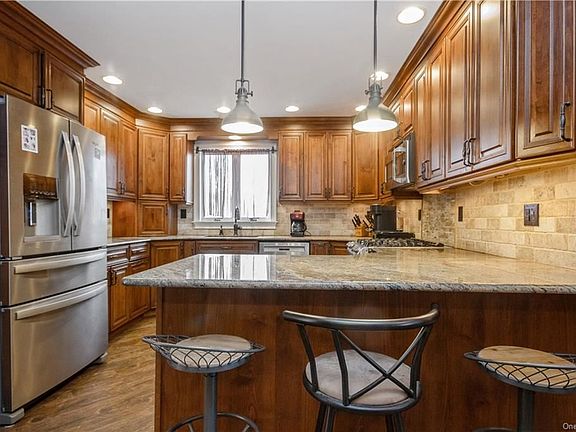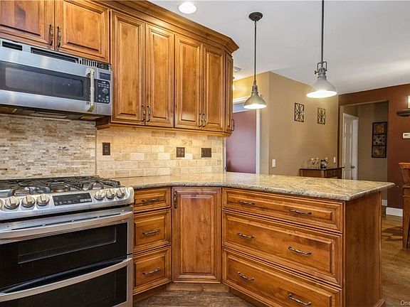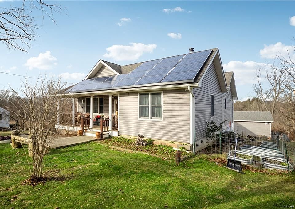Welcome to this nicely updated, snug and sunny home. Major renovations undertaken starting 2004, including roof, solar panels, kitchen, baths, insulation, siding, windows. Newer pavers to mahogany porch with structural fiberglass pillars. Owned by meticulous plumber, so heating system well done with Peerless boiler, whole house filter, water softener system. AC new last year. Septic has cement tank. All new drainage system in basement. Owned solar panels mean frequent $0 electric bills. Electrical totally updated throughout in 2005. Red oak floors, Omega kitchen cabinets, granite counters, tumbled marble backsplash, stainless appliances. Newer baths with large walk-in shower in primary bath, dual vanity sinks. Exterior large parking area, plus one car garage under. Front yard and pillared entry posts have low voltage lighting. Owner has pressure washed and will repaint foundation parging. Charming and complete!