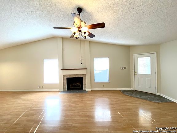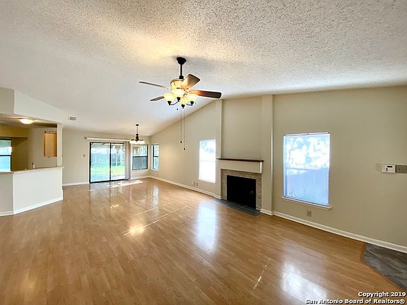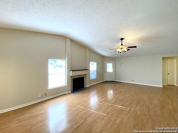 Open floor plan with lots of space for entertaining. The expansive living dining combo has vaulted ceilings, wood laminate floors and wood burning fireplace. Kitchen has new smooth top range and dishwasher, breakfast area with bay window and large pantry. Master bedroom is oversized with big walk in closet and full bath with double vanity. Back yard with covered patio is great for backyard bar b ques. Located close to bus line and in between RAFB and Fort Sam.
