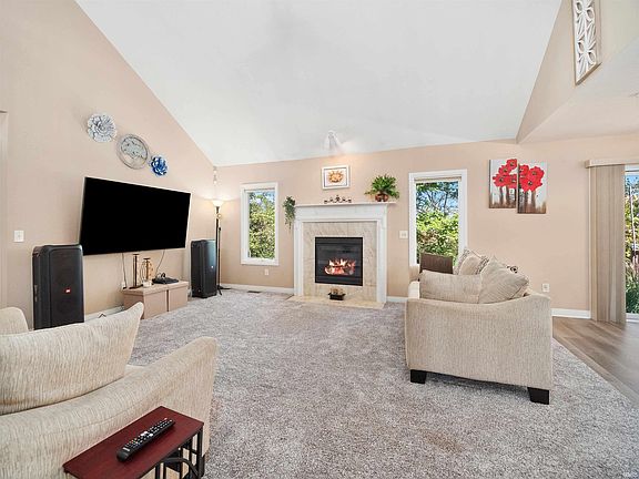 **Contingent accepting backup offers**Discover the essence of luxury living in this immaculate home. A grand great room welcomes you with vaulted ceilings and a cozy gas log fireplace, setting the stage for unforgettable gatherings. The dining area seamlessly adjoins an updated kitchen, boasting custom cabinetry and Corian countertops, where all top-tier appliances are yours to enjoy. The master bedroom suite, conveniently situated on the main level, features a walk-in closet and a lavish bathroom complete with a twin sink vanity, a rejuvenating jetted tub, and a separate shower. An adjacent den with elegant French doors offers versatility for work or relaxation. On the main floor, you'll also find a convenient half bath and a laundry room, complete with a washer and dryer. Ascend to the upper level to discover a lofted family room, two additional bedrooms, and a well-appointed guest bath. Step outside to your private haven, an entertainer's delight boasting a custom deck and a stamped concrete patio. Whether you're hosting gatherings or seeking solace in the great outdoors, this home offers it all.