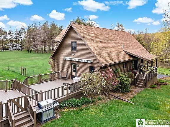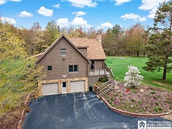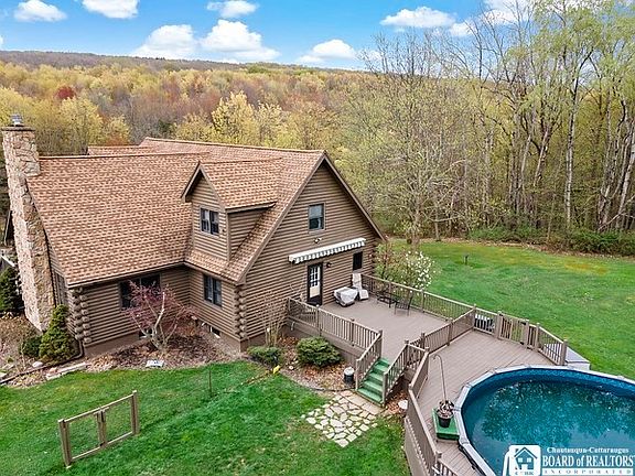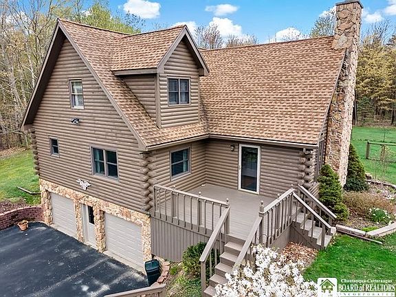 Log Home situated on 4 acres in the Town of Arkwright, Fredonia School District! First floor primary suite with updated bathroom and large walk-in closet (9.5 X 4.5).Two bedrooms and bath on 2nd level w open loft overlooking living room w beautiful stone fireplace w newer gas insert & chimney vent cap! Large dining room, freshly painted, plus, updated light fixture & French door to the side deck! Large kitchen with granite countertops, ceramic backsplash! First floor laundry! Walk-in pantry! Partially finished basement for added living space! Attached, over-sized 2-car garage, plus 24' X 24' pole barn! Lovely landscaped yard, circular, blacktop driveway, large back deck leads to above ground pool! Fenced dog run! Multiple decks to enjoy the amazing views all around!