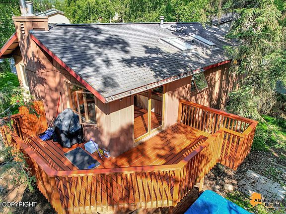 Looking for Convenience and Privacy? This is it! Amazing light throughout this open concept home, at the end of the cul-de-sac directly next to miles of trail systems. This home has it all with 2 living areas, 4 bedrooms, 2 baths, BBQ ready decks, 2 car garage and RV Parking. Additional features include gourmet kitchen, pantry, vaulted ceilings, skylights, cozy gas fireplace, amazing views.Large Family room with wood stove and French Doors to the back yard and it's Hot Tub. Separate Laundry room for even more convenience. New Furnace in 2019, New water heater in 2018. Eaglewood Homeowners Association dues are paid quarterly. RV/Boat parking is allowed year round! Large kitchen island is getting a new counter top prior to recording; sample of the solid surface is on the Kitchen island. This amazing home comes with a working hot tub that is being sold as is. Come live the Alaskan life of privacy and convenience.