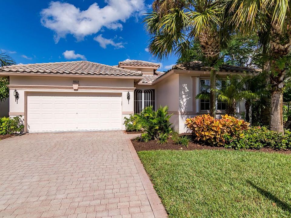 Your search has ended! Fall in love with this spacious 3 bedroom, 2 bath, single-story home situated on a corner lot w/sun-drenched rooms & breathtaking lake views. Pride of ownership shows in this home w/upgraded features like kitchen w/wood cabinets & corian counters, expanded screened patio, oversized garage and 3 large bedrooms w/outfitted closets. Additional features include Central Vac, New Washer & Dryer, Newer AC & Hot Water Heater, Accordion Shutters. Bellaggio offers Country Club living without the high fees. The expansive clubhouse boasts a gorgeous lobby & sitting area overlooking the beautiful community pool. Equipped w/multiple card rooms, fitness center, cafe, library, art-studio, ballroom, 10 clay tennis courts, 2 bocci-ball courts & more.