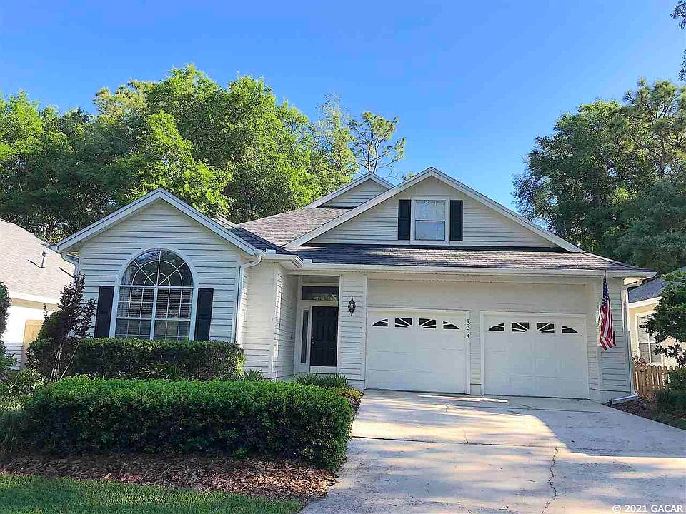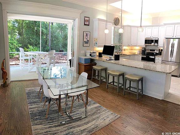 This exquisite, move-in ready, Jeff Wilde, masterpiece features gorgeous wood floors, a remodeled, contemporary kitchen with granite counters, stainless appliances and a beautiful skylight making the house light and bright. Relax play or entertain in style while enjoying the delightfully open plan that includes a cozy gas fireplace and sliding glass doors that retract to invite you out to a quiet and tranquil lanai overlooking a peaceful and natural back yard with an adorable fenced dog run on the side. Additional highlights include A rated schools, zoned AC w/ 4 controls, irrigation system, front yard lawn care included and an extraordinary location down the street from Hampstead Park, the Haile Golf and Country Club and an easy commute to UF, the VA and Shands.