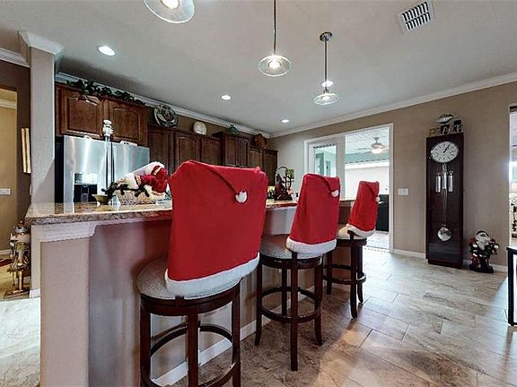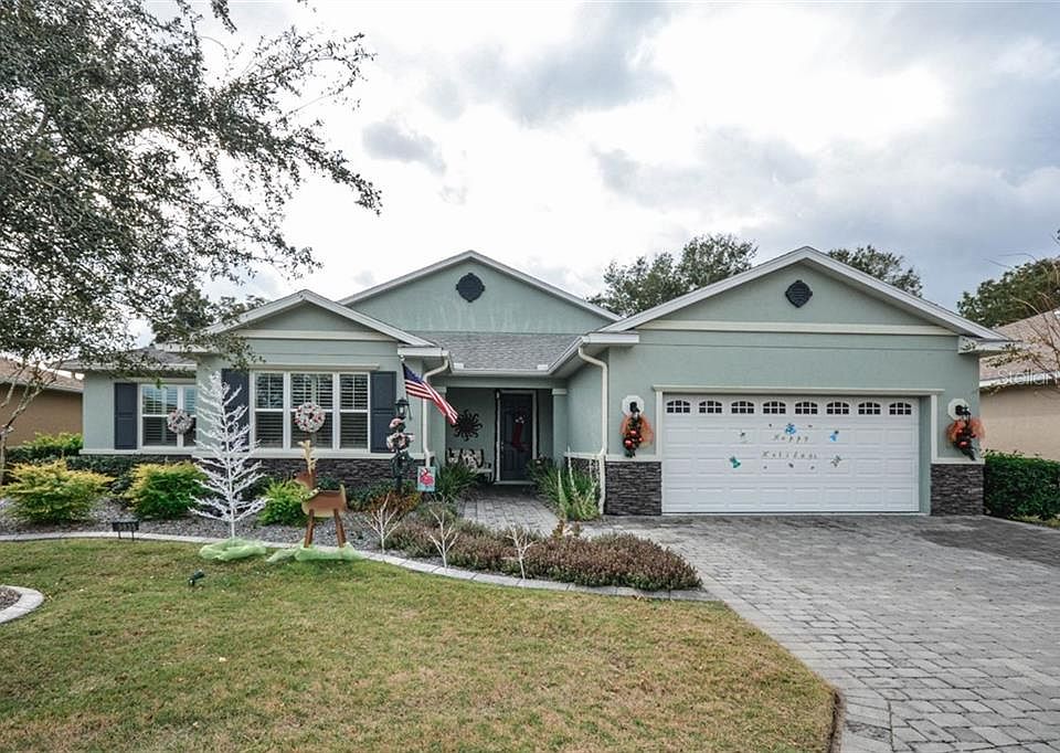 PREMIUM GOLF LOT with COUNTLESS UPGRADES! This beautiful spacious Westminster model home is located in the Windsor West neighborhood of the highly sought after gated 55+ golf community of On Top of the World. To fully appreciate the residence, make sure you view the 3D Virtual tour. Home features 3 bedrooms (2 Master Suites), 3 baths, oversize extended 2-car garage to include Golf Cart parking/workshop area, Flex Room, enclosed screened courtyard, huge screened Lanai under roof and birdcage with deep golf course frontage, split bedroom floorplan, 9'4" ceilings throughout, crown moulding throughout, 8' doors throughout, Quartz counters, Maple cabinetry throughout, huge custom pantry with pull-outs and electric outlets, Owner's entry, custom closet systems by Pro Closet Design in all closets, walk-in Roman shower in Master Bath, custom window treatments and top-down/bottom-up room darkening shades, ceiling fans throughout, large Laundry Room with additional storage cabinets and sink, neutral tile in most rooms, neutral carpet in Master bedroom and front bedroom, spacious open kitchen with eat-at island, under cabinet task lighting, custom backsplash, top-of-the-line stainless appliances (refrigerator, range and dishwasher have transferrable warranties), 3 Solar tubes for additional natural light in Laundry Room (Solar night light), Master closet and Master Shower Room, core filled insulated walls, widened paver driveway and front walk, professional landscaping with custom poured edging and marble chip beds, and MUCH MORE! A more complete list of features and upgrades is available. Lawn care, basic cable, gym, exercise classes, 24-hour guarded gate, exterior painting, and more are included in your monthly HOA fee. This home offers a wonderful floor plan with lots of room and privacy. 2 Lanais - smaller Lanai accessed from Kitchen and Flex Room and huge Lanai with privacy screening at back of home. 3 natural gas bibbs for grill hook-up in both Lanais and outside large Lanai. Garage features split unit HVAC for climate control, overhead hanging storage, epoxy floor finish with heavy duty industrial rubber mat covering and pull-down screen door with built-in man door.
