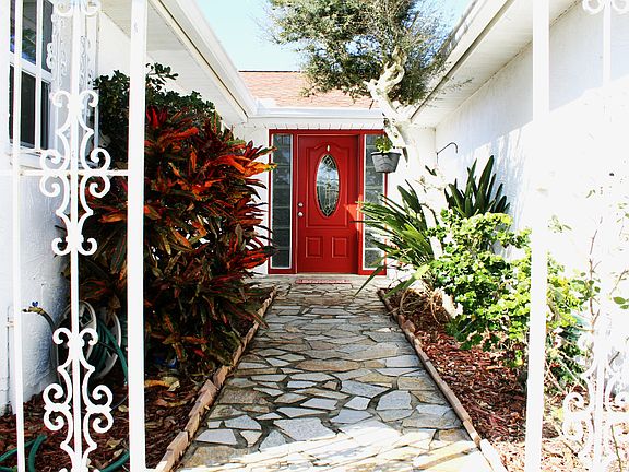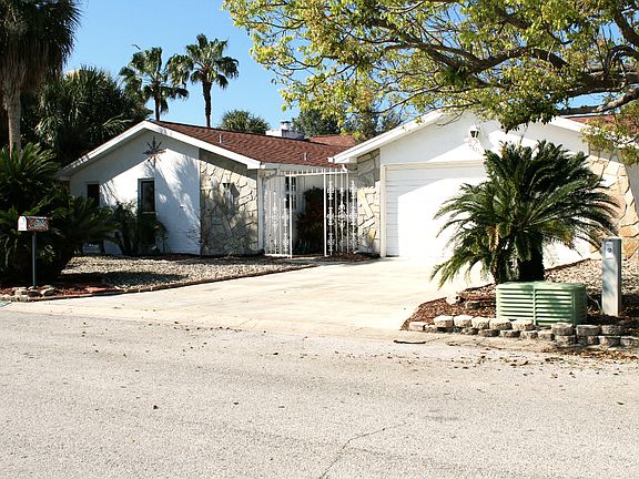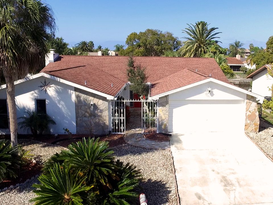 One or more photo(s) has been virtually staged. Back on the Market BRAND NEW ROOF and PRICE IMPROVEMENT!! Welcome Home!! Great Opportunity to purchase this Beautiful 2,446 Sq Ft Waterfront Home. This 3 Bedroom, 2 Bath, 2 Car Garage Home is Nestled on a 70x140 PREMIUM WATERFRONT LOT! Great Layout, and Updates throughout make this Home a SHOW STOPPER! Leaded Glass Door Entry leads to Foyer overlooking the Open Floor Plan. Lots of Natural Light! Formal Living Room & Dining Room create a perfect Space for Entertaining. Love to Cook and Entertain? The Spacious Kitchen features Stainless Steel Appliances, Large Breakfast Island, Glass Top Range. Wash the dishes while overlooking your Beautiful View of the Lush Landscaping & Water Views. The layout is perfect in this Home, offering a Split Floor Plan. The Kitchen opens up to the Spacious Family Room with a Wood-Burning Fireplace & Custom Built-in Shelving. The Master Suite features a Large Walk-in Closet and Updated Master Bath with Dual Vanity Sink & Step-in Shower with Decorative Tile Inserts. Two Additional Bedrooms with Large Adjacent Guest Bathroom features Shower/Tub & Dual Sinks. Sliders lead to the Florida Room with BBQ Pass through & Bar. Now lets get to the best part, the GORGEOUS Water View with access to the GULF! Bring your Boat, Kayak or Water Toys! Updated Seawall. Enjoy a cup of coffee or glass of wine on the Covered Patio surrounded by Lush Tropical Landscaping overlooking the Peaceful Water. Upgrades Include: New Roof 2021, New Front Door 2018, Garage Door 2018, Sea Wall 2015, Solar Panels-Solar Photovoltaic installed 2017 - Low Energy Bills- cut the electric bill in half, Patio Ceramic Tile Flooring 2017, Ceiling Fans Installed 2019, Exterior Painted 2018. Great Location - Close to Restaurants, Shopping, County Parks, Beaches, & the Gulf of Mexico.